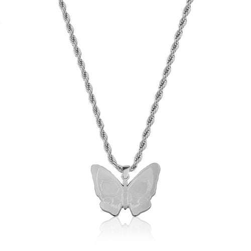 The Butterfly Effect Pendant boasts a completely unique design featuring an intricately carved skull within the delicate frame of a graceful butterfly.